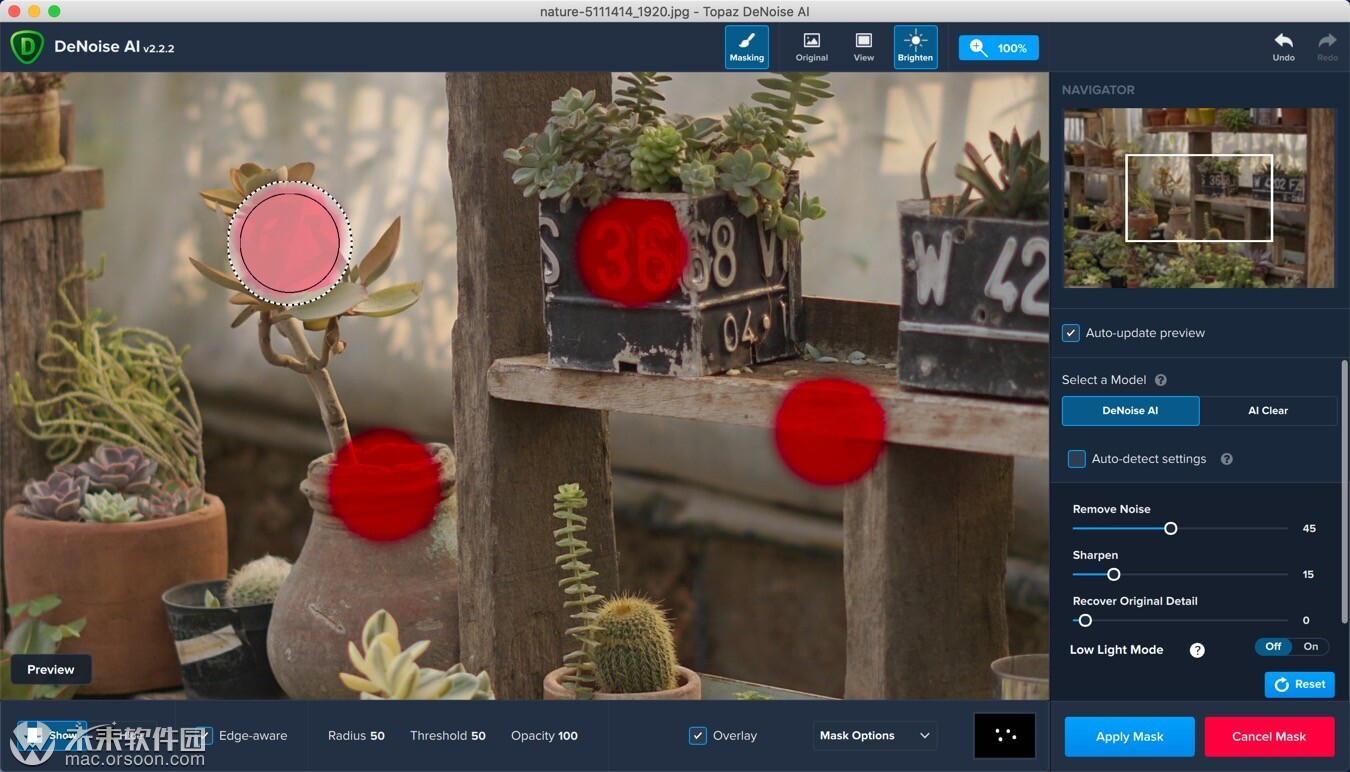 在您的降噪工作流程中,您可能会遇到从某些区域去除噪声效果最好的图像,例如天空,但没有冲击波……在鸟类的光滑羽毛上,而不是粗糙的树皮上……在光滑的外皮上汽车,而不是人行道。DeNoise AI允许您有选择地在图像的某些区域应用降噪,并保持其他纹理不变。